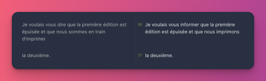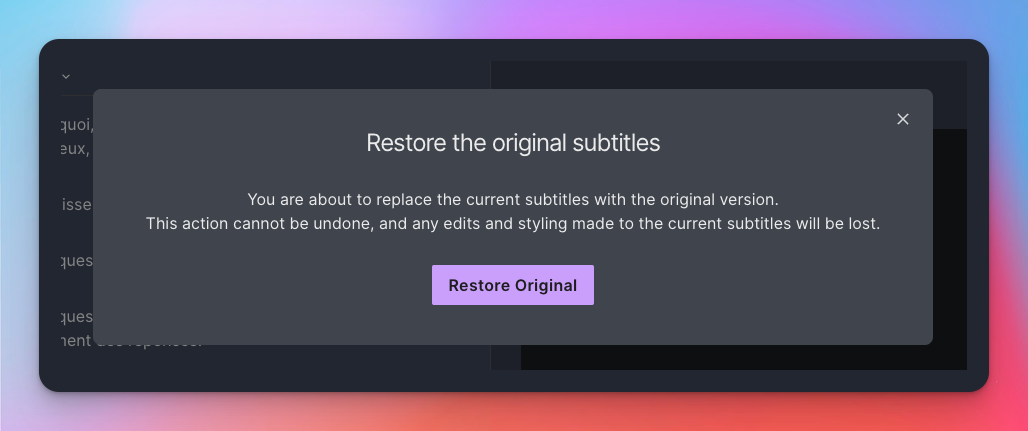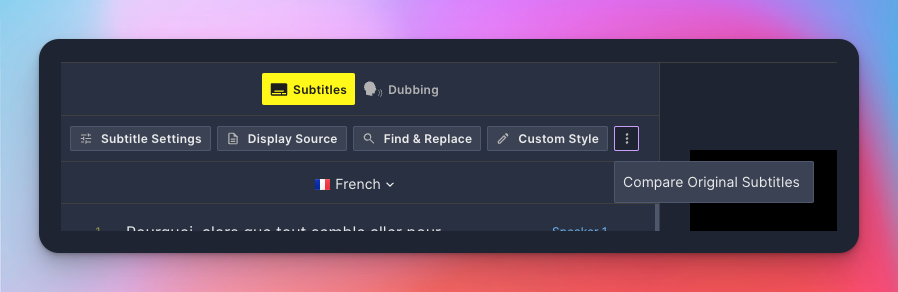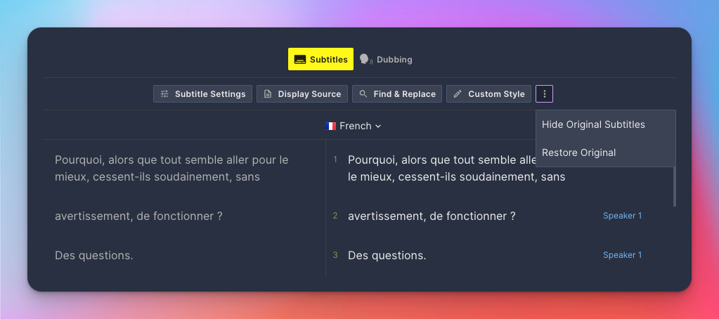 You will then see two columns in your subtitling area: the column on the left represents the original subtitles, the column on the right represents the subtitles that have been enhanced by the Guideline. If you wish to restore the original subtitles to replace those generated by the guideline, you can click again on the button with the three dots and then click on "Restore Original".
