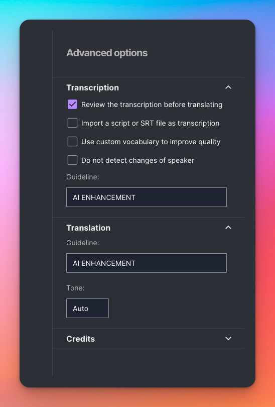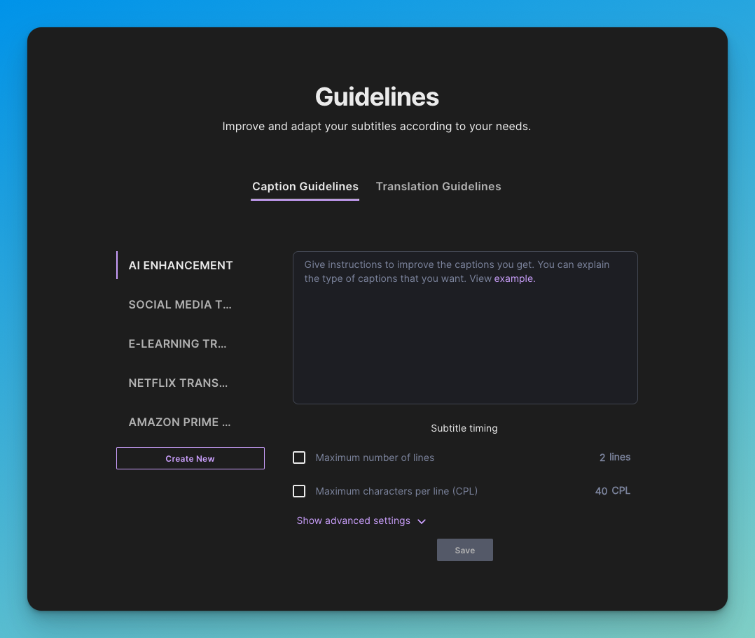 The Guideline Feature allows you to input specific instructions to tailor the transcription or translation output to your exact requirements. Whether you want to refine the text, adapt the tone for a specific audience, or ensure technical compliance with subtitle standards, this feature puts the control in your hands.