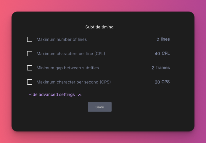You can also define specific technical parameters to ensure your subtitles meet industry standards. This is particularly useful if you're creating subtitles for long-form content, VOD platforms, TV or film.